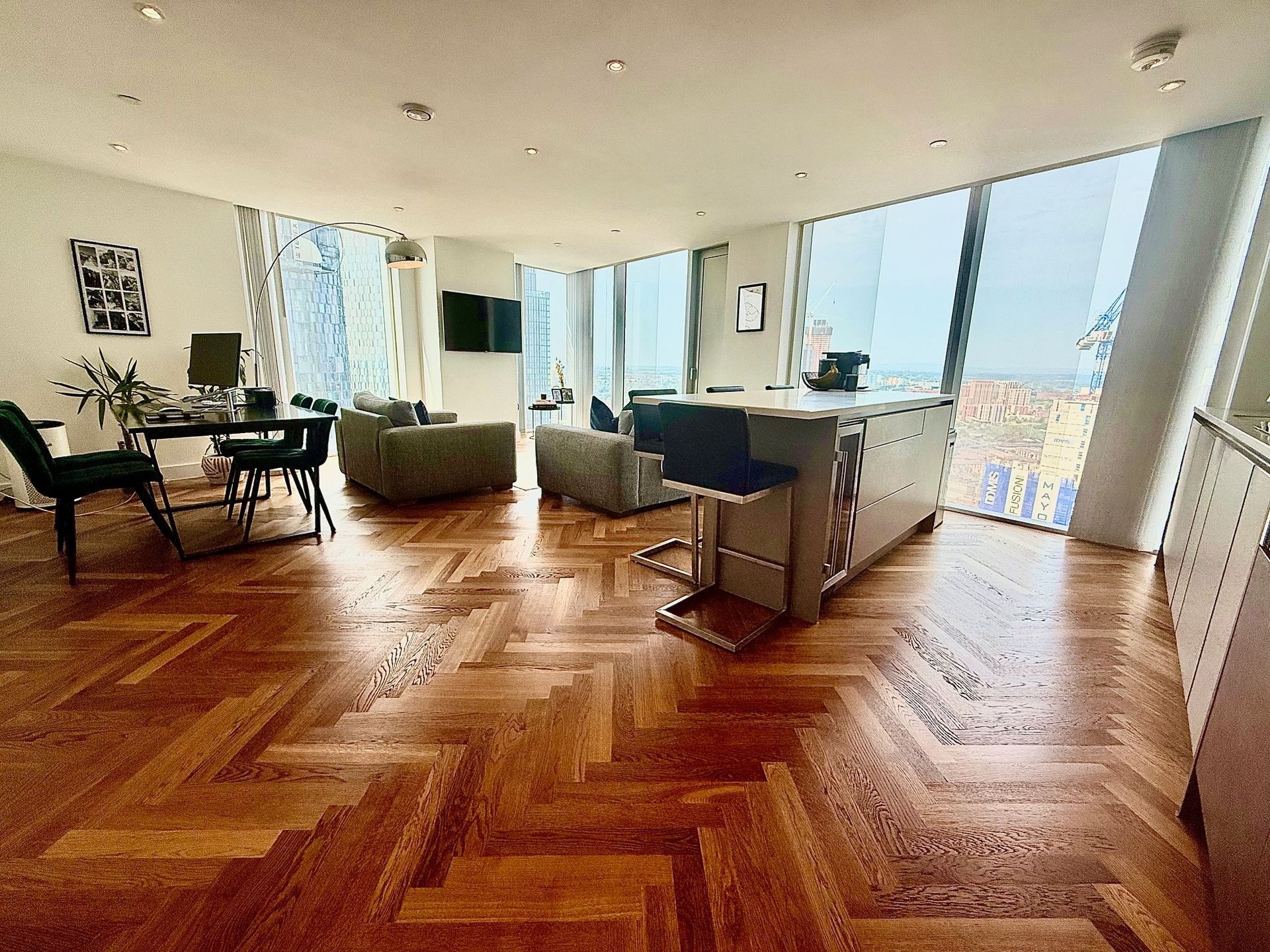 A luxurious two bedrooms corner apartment situated on the 32th floor of South Tower, the tallest residential skyscraper outside London.