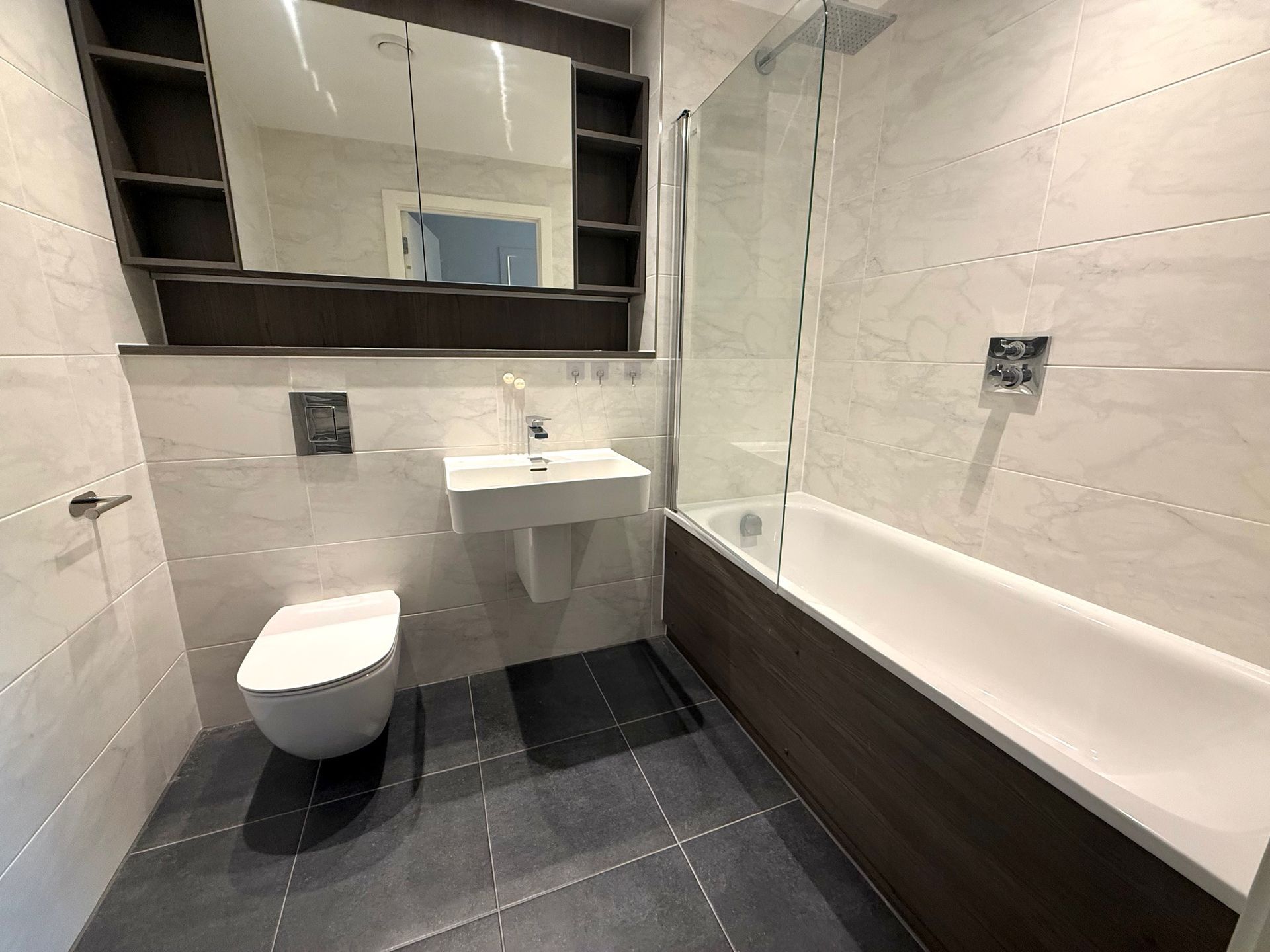 Modern, fully-tiled bathroom with premium fixtures